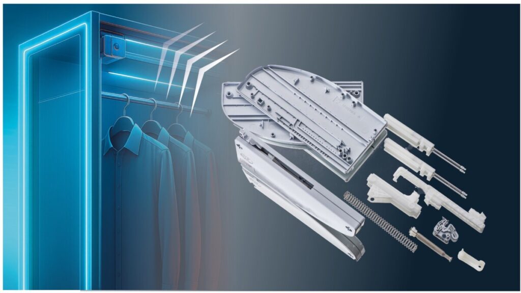 Wir fertigen diverse Komponenten für Möbelteile z.B. Bremsen als Baugruppe für Schwebetürenschränke oder im Digitaldruck individualisierte Spritzgussteile.